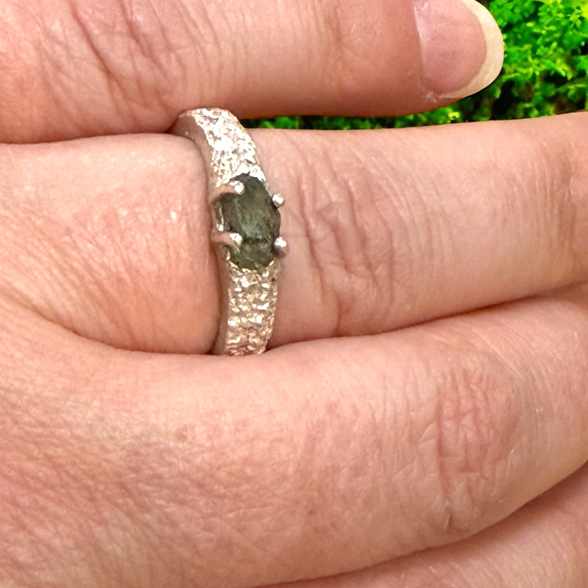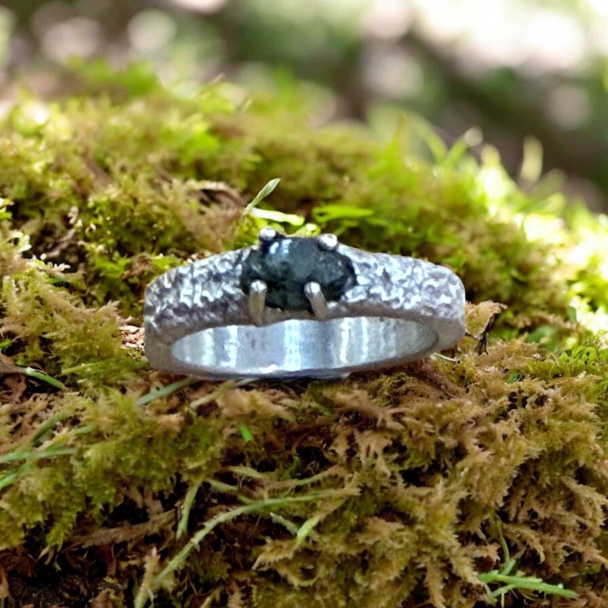 The stone itself is green like deep leaves after rain. It doesn’t sparkle so much as glow. Catches the light the way dew does - quietly, when no one’s looking. And the band, rough and uneven, holds the memory of root and soil. No polish, just presence.
