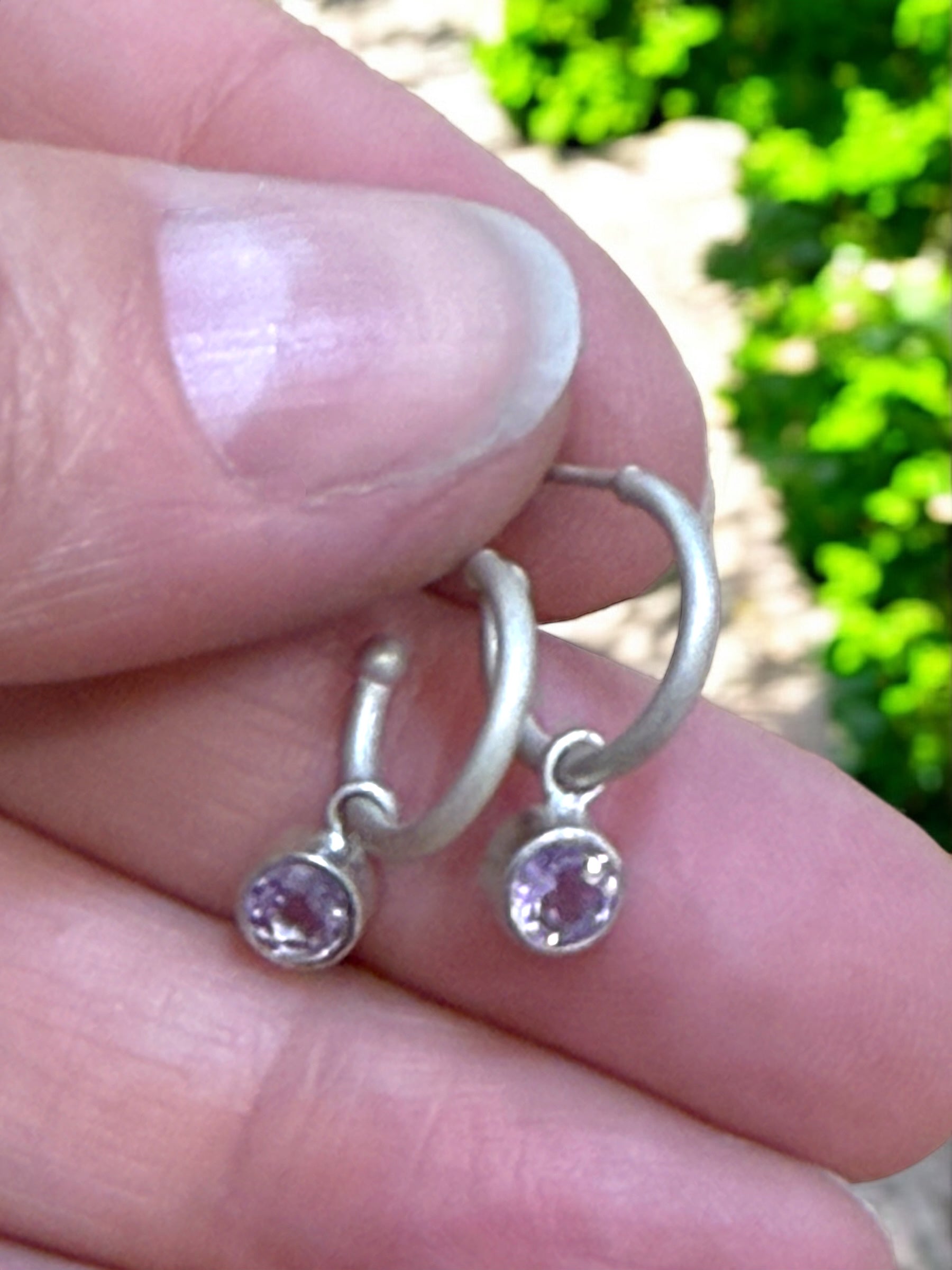 Amethyst has long been thought to calm the restless mind, ward off illusion, and deepen intuition. The charms can be slipped off, leaving behind a simple silver hoop, quiet, versatile, and light against the skin.
