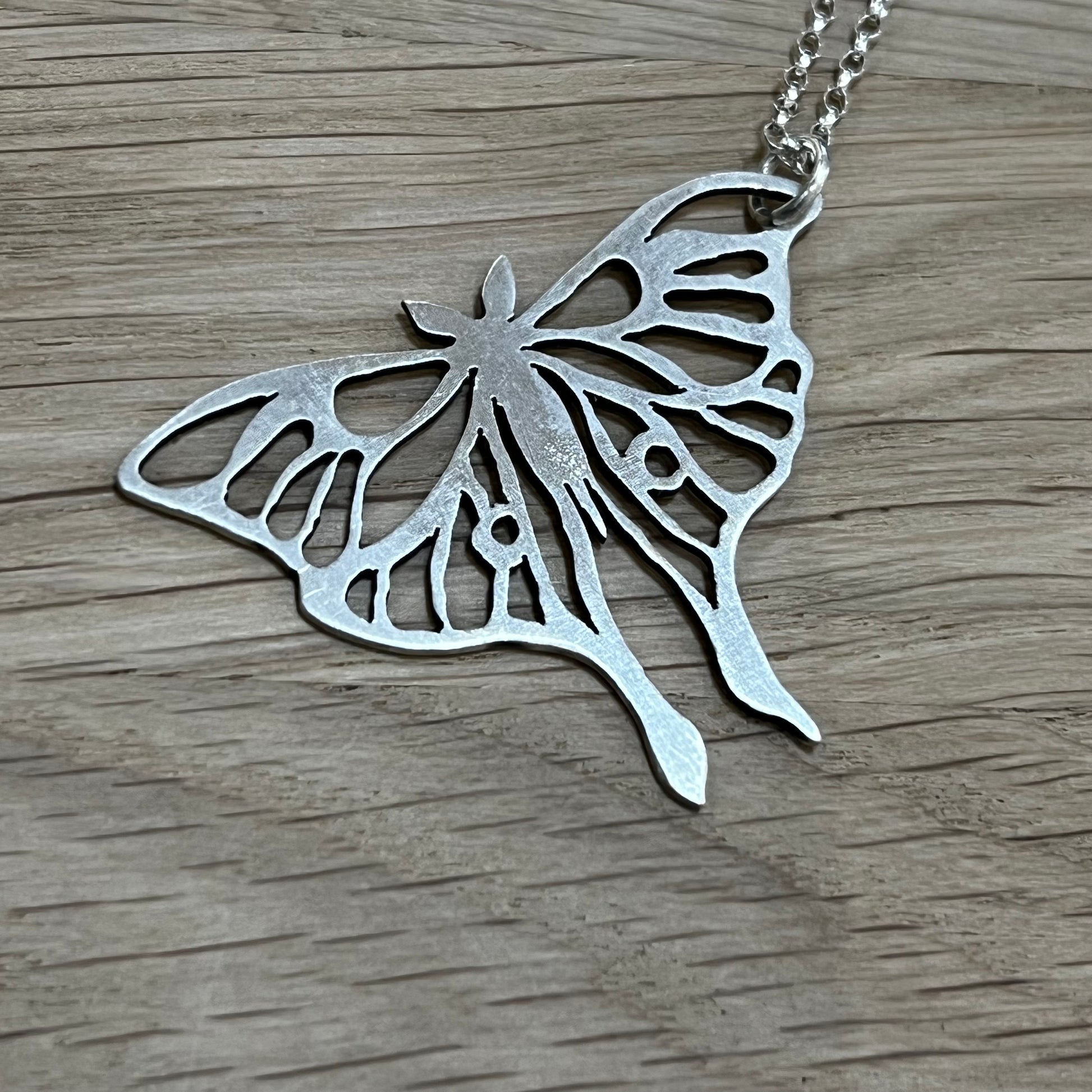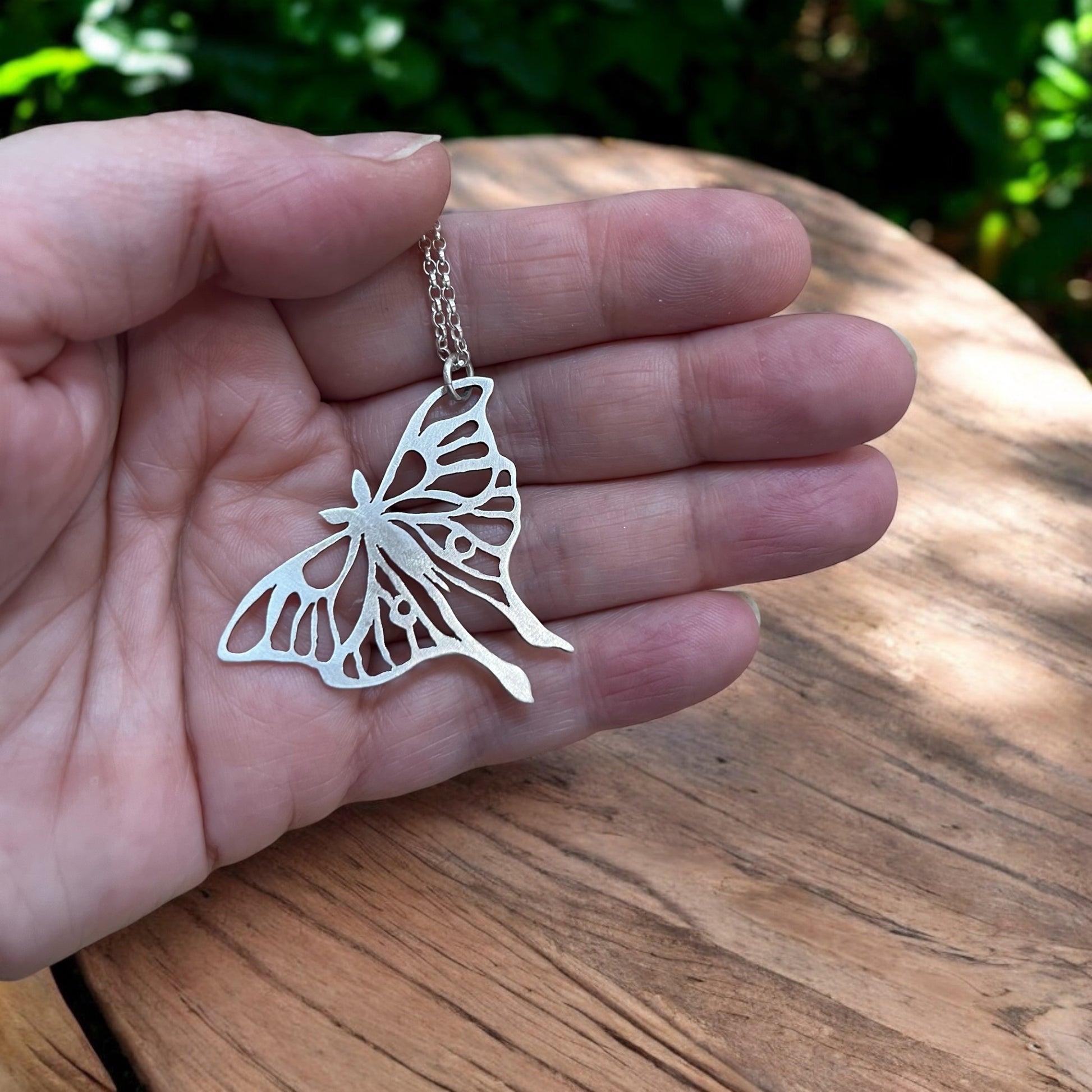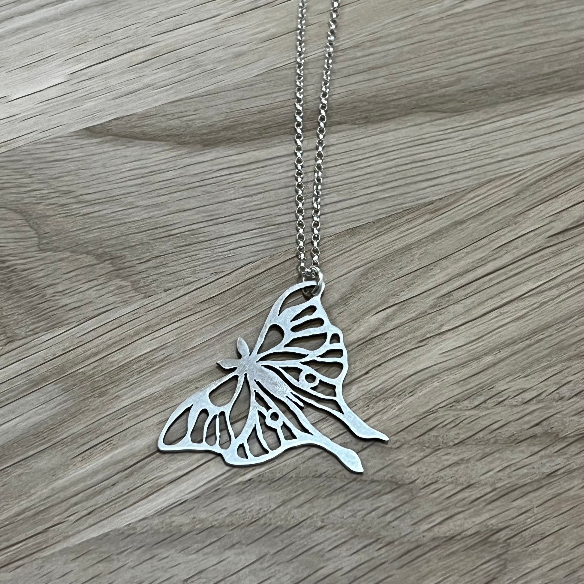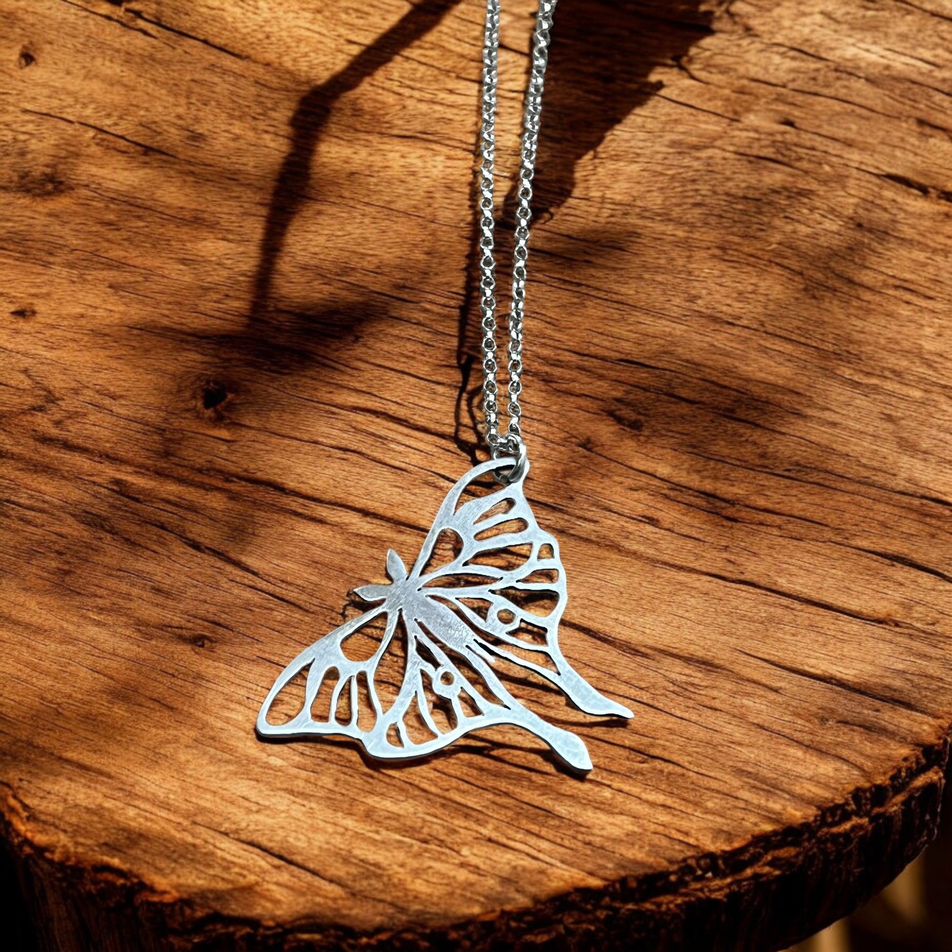 Flight is a meticulously hand pierced sterling silver pendant that captures the delicate grace of butterflies, often seen as messengers from other realms.