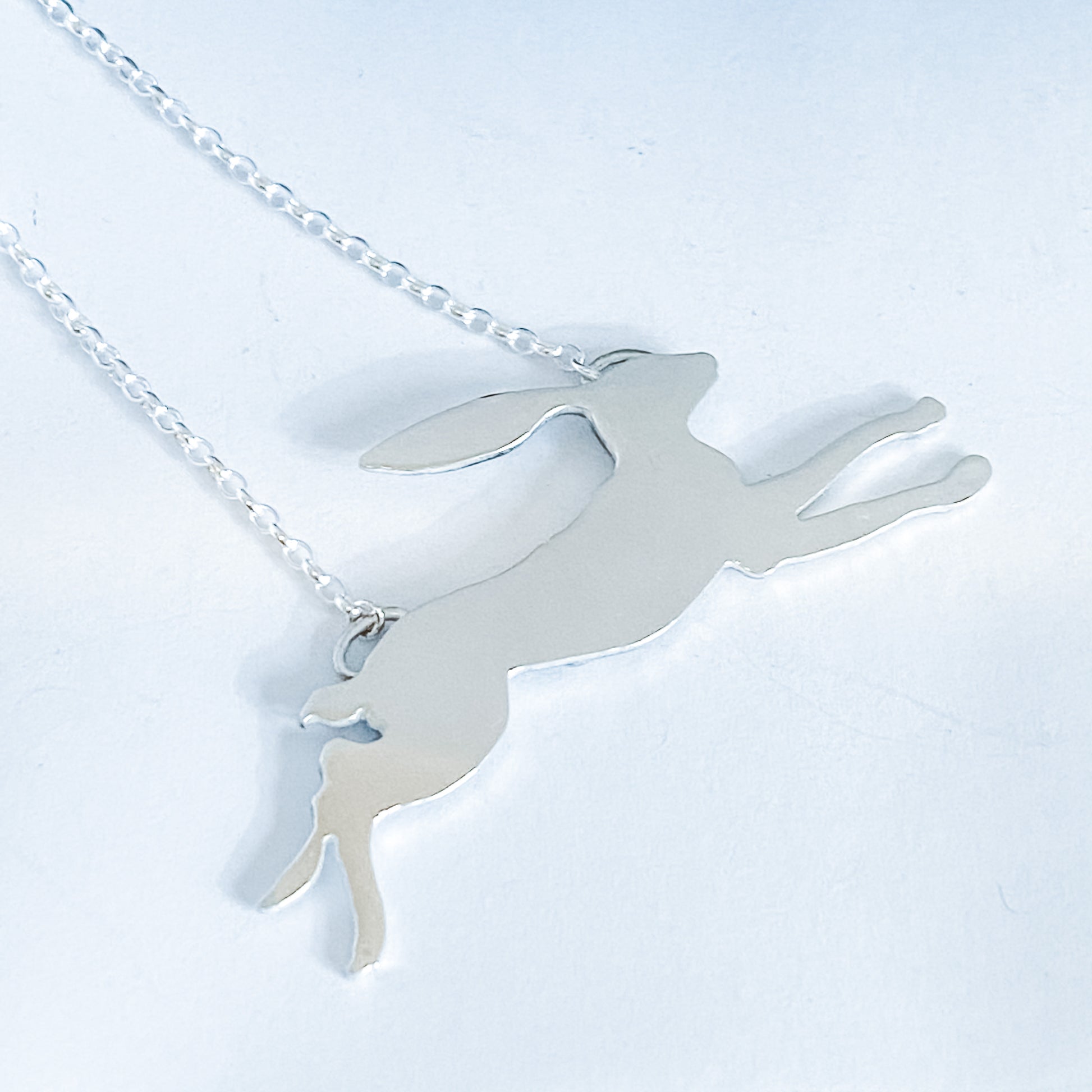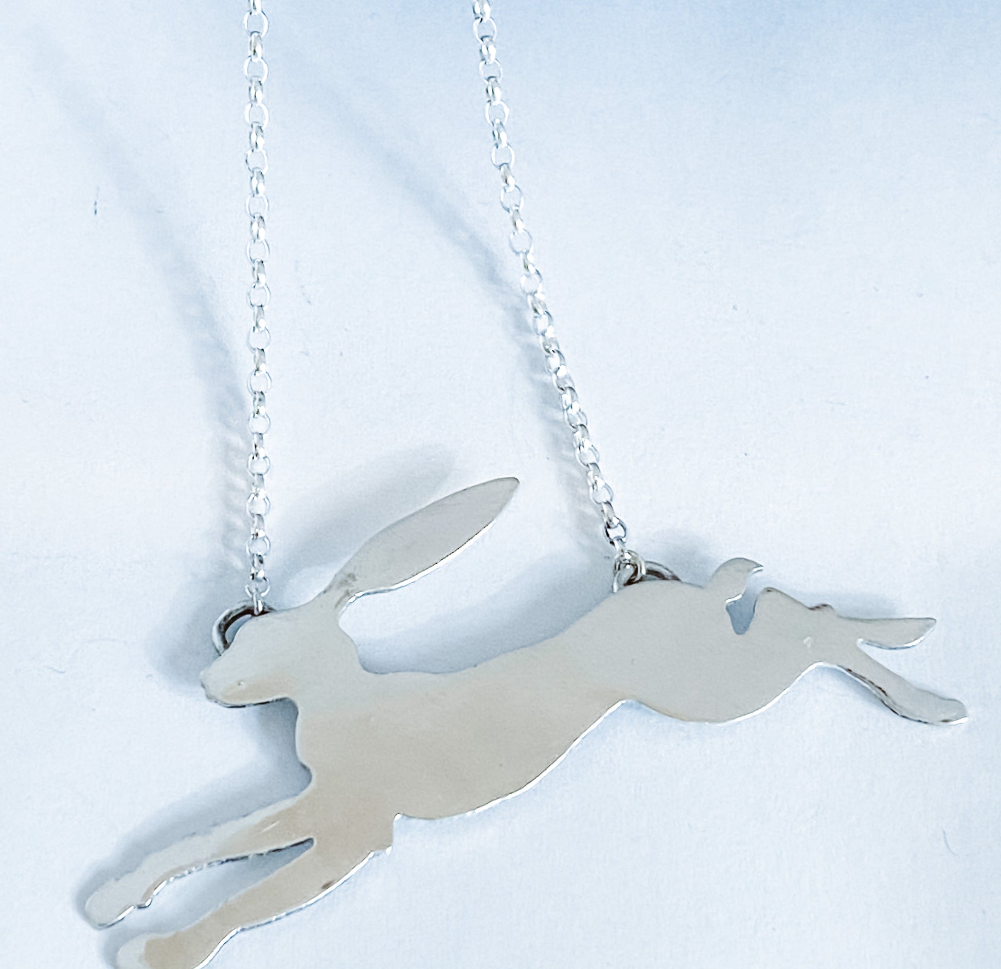 Cut by hand from recycled sterling silver sheet, this leaping hare is caught in that breath between earth and sky. In old tales, hares were bound to the moon — swift-footed messengers running through the turning seasons, from the frost-bound hush of winter to the quickening green of spring.