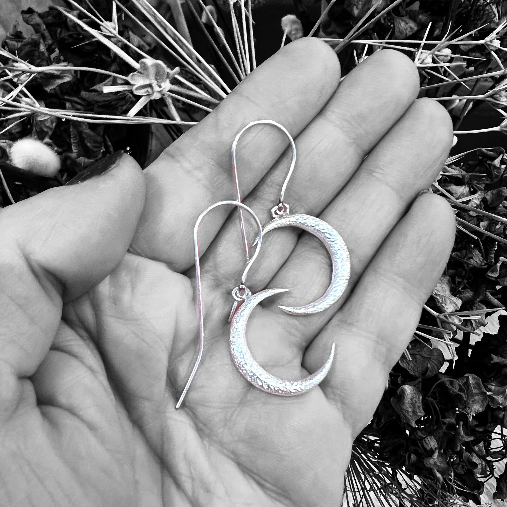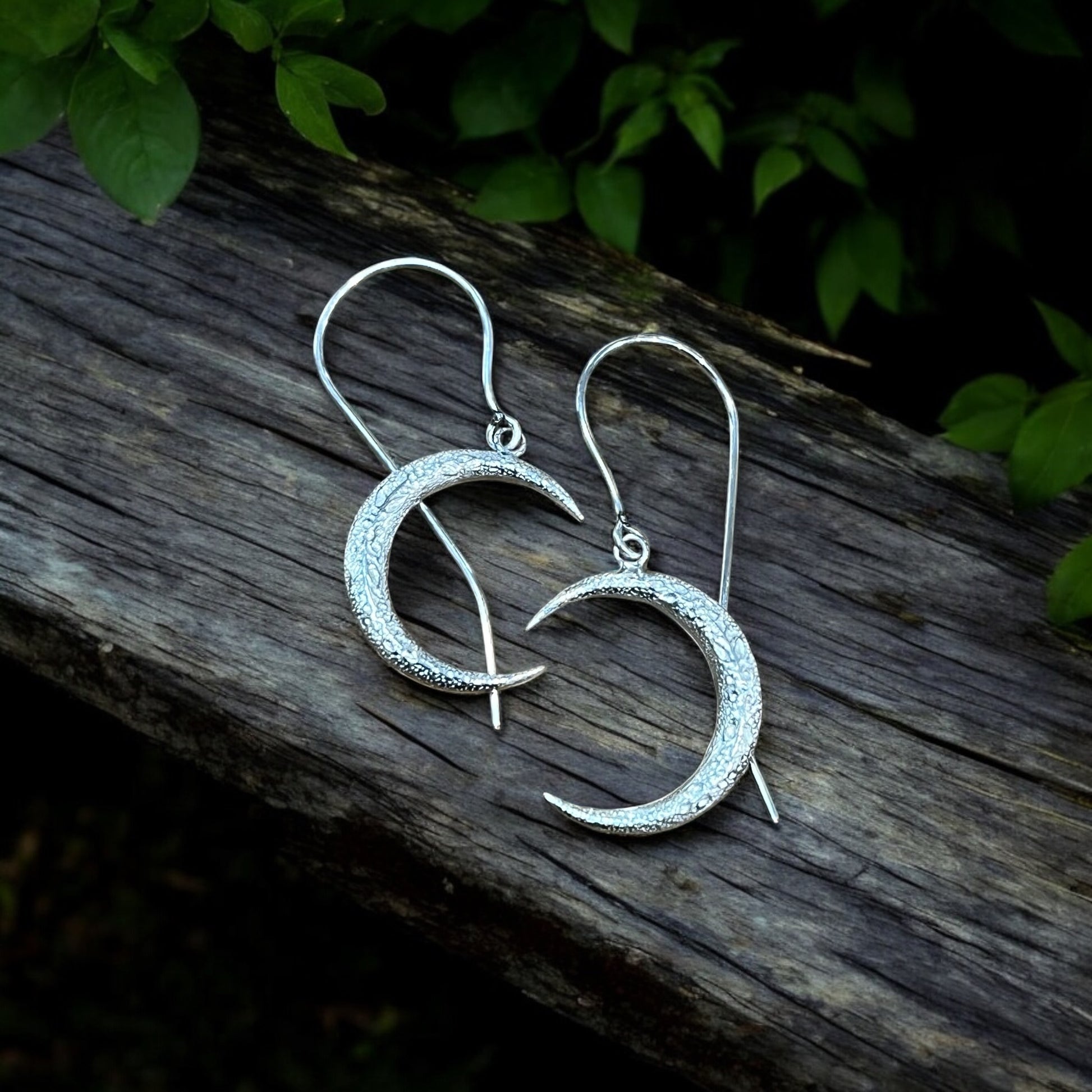 The gently curved crescents hang gracefully, swaying like moonlight filtering through forest branches. Their polished, organic finish adds a hint of ancient charm, as though these silver moons were hidden away in a storybook forest, waiting to be discovered.
