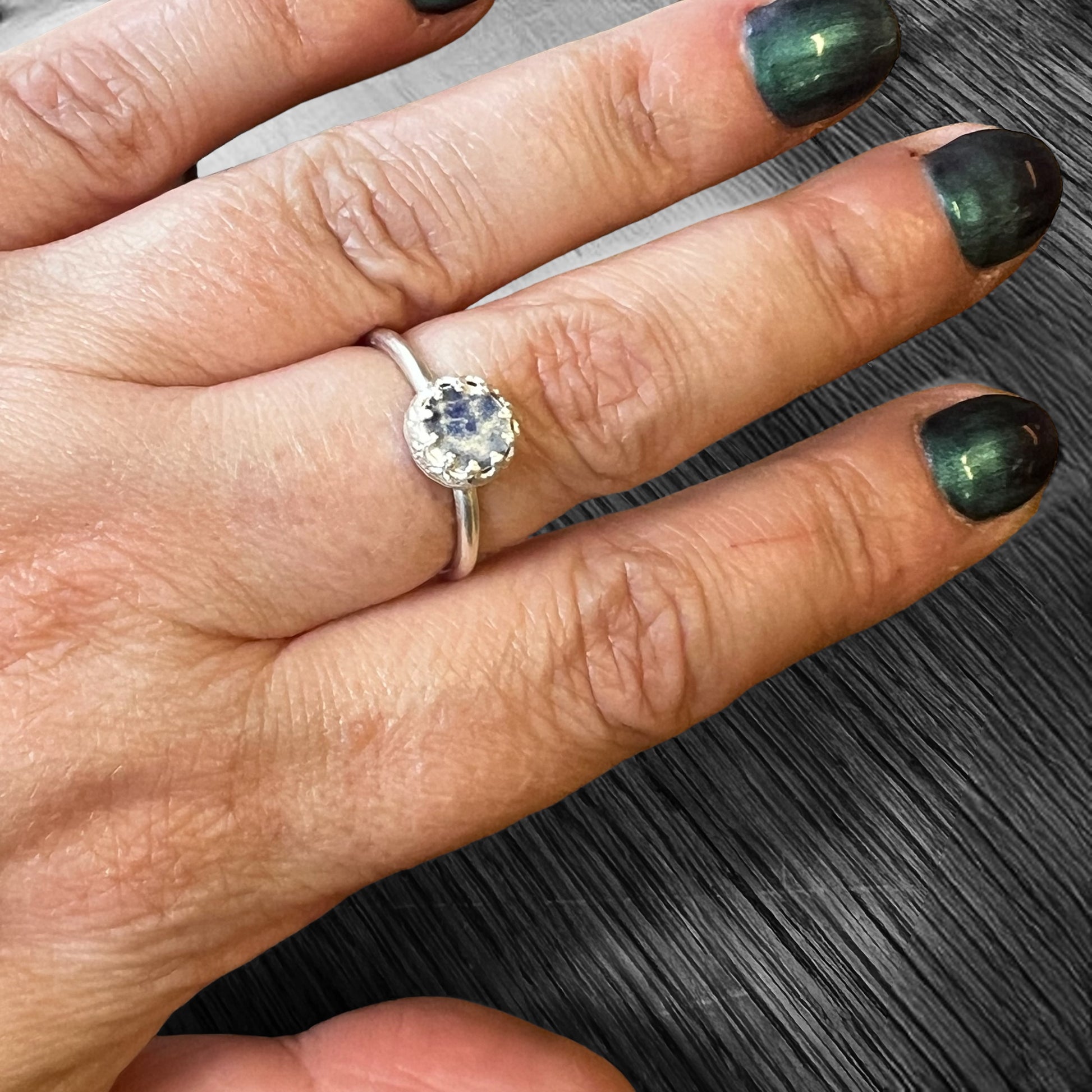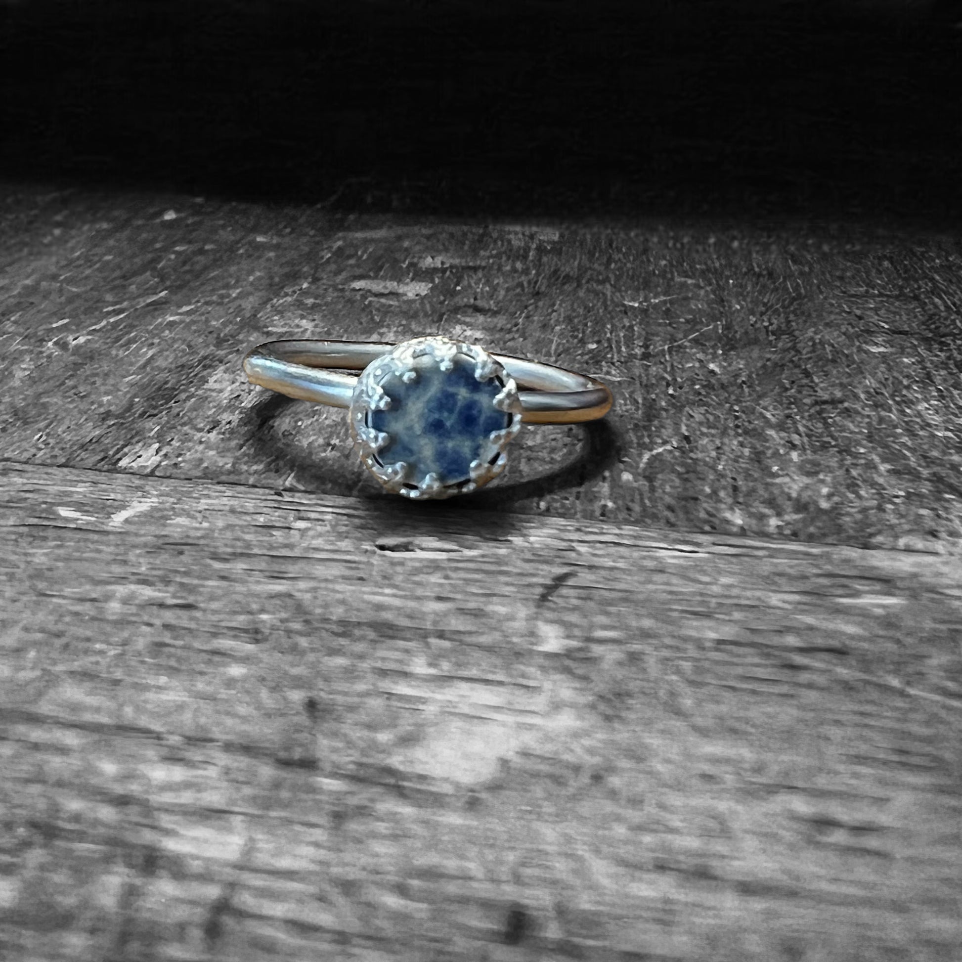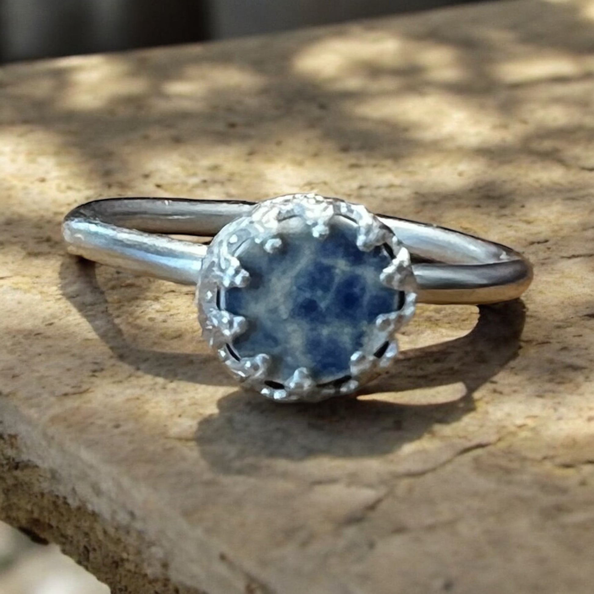 This ring, nestled in recycled sterling silver, captures the essence of forgotten tales and ancient mariner quests. The delicate blue, echoing the depths of cerulean waters, tells stories of ships that once sailed the briny deep, their sails billowing in the salt-laden breeze.