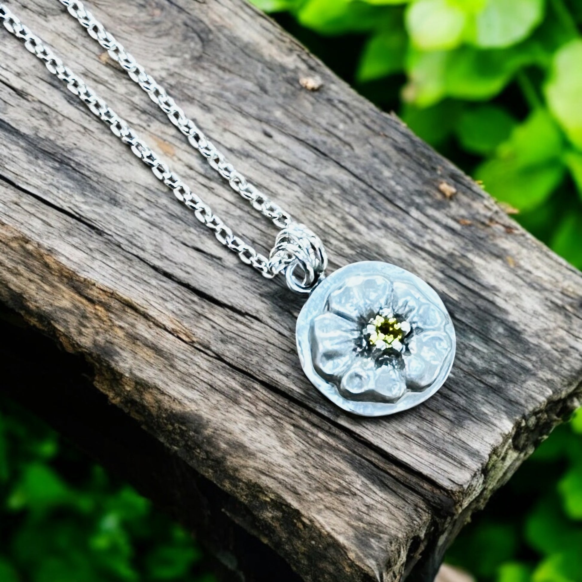 Created by hand from recycled sterling silver, this pendant holds the shape of a wild bloom, soft-petalled, weather-worn, and quietly enduring. At its heart, a single yellow sapphire catches the light like pollen or flame, bright and unexpected.